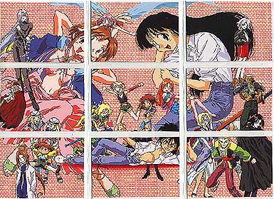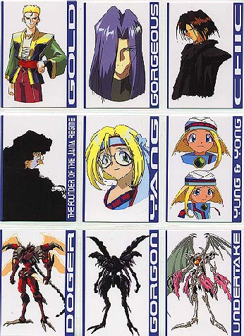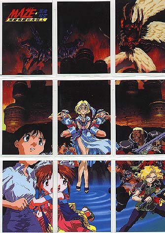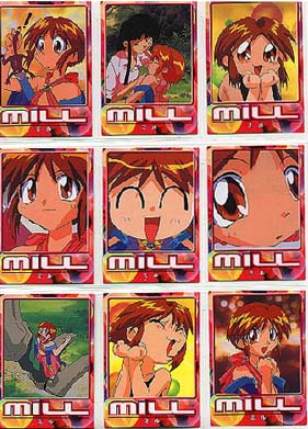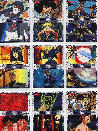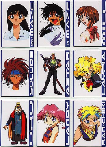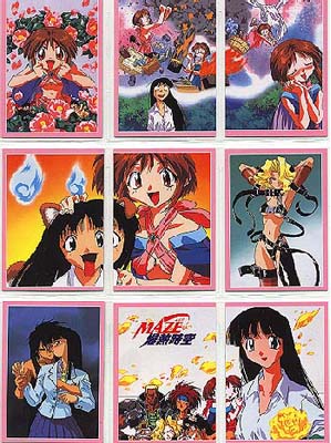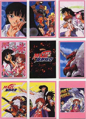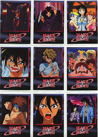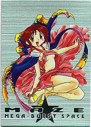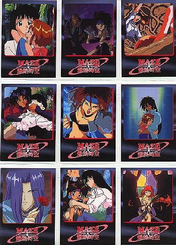 Made by COSPA in Japan 1998 Standard card size, however, cards are VERY glossy on both sides and just a little bit thinner card stock than usually find. 135 Cards in complete set 129 regular cards, 6 foils 10 cards/pack, 15 packs per box 2 foils in a box Absolutely lousy distribution!!! Cards cover the TV series, OVA and movie (yes, there was a movie!) To make things more interesting, the cards aren't numbered 1-129, it's broken down into sections, each with it's own code. oO Character Cards: CH-01-18 (counted in with the 36 film cards) TV/OVA Cards: TV-01-18 Film Cards: MV-01-36 Gallery Cards: GL-01-18 Cho, Chotto Matte Cards 01-09 (Maze) Ukyu Ukyu Cards 01-09 (Mill) Desu Non Cards 01-09 (Randy) Akahori Satou Select Cards 01-09 (one of the creators of Maze) List (Index) Cards 1-3 Foil Cards SP1-6 May 2021: From another card collector, Mikk Kukan, I learned that the set also has a SP00 card. oO Ah, those slips of paper. . . Took me years to know the slips of paper got in a pack are needed to send away for a mail away/present OR lucky draw card. X number of slips (15-30 typically) are needed. If mail away/present type, then you're guaranteed to get the card. A lucky draw type, the slips only give you the CHANCE to win the special card. SP00 for MAZE set is the lucky draw type. Mikk Kukan said card was limited to 1000 cards, and every 3 slips gave a person a chance to win one. Also need to be lucky enough to have someone to help you in Japan to get the slips mailed in. . . Why I rarely tried to go after these mail away/present/lucky draw special cards. Better (or maybe not) getting such cards via auction. |